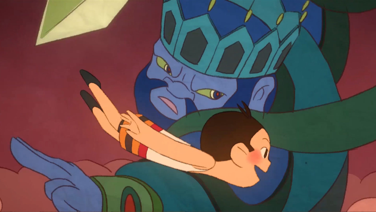 El niño está desconcertado por el hecho de que su abuela haya tomado el único melocotón para adorar a Buda. Su deseo de probar el sabor fresco del melocotón le lleva a utilizar todas sus 18 habilidades con la esperanza de conseguir robar el melocotón. En el proceso, el chico entra en su mundo de fantasía y lucha con los Cuatro Reyes Celestiales, pero el melocotón se rompe accidentalmente durante la pelea, lo que frustra a ambos. Pero en lugar de regañar al niño por esto, la abuela prevé la esperanza de vida en el grano de melocotón desnudo...